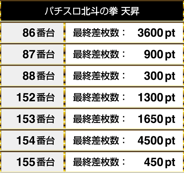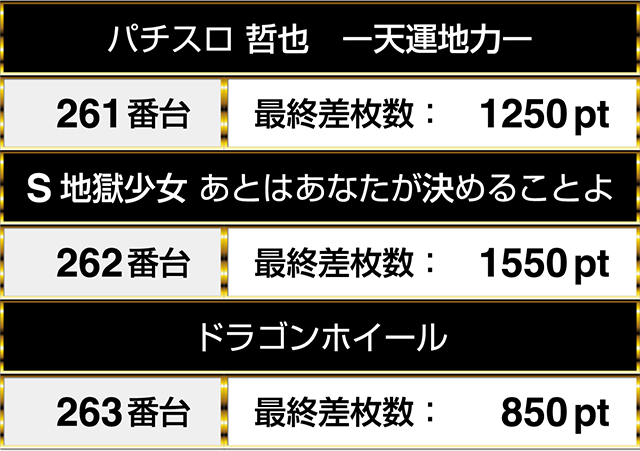 最終的には2箇所に3台以上の並びでプラスptとなる場所があり、そのうちの2台が3000ptオーバー!!