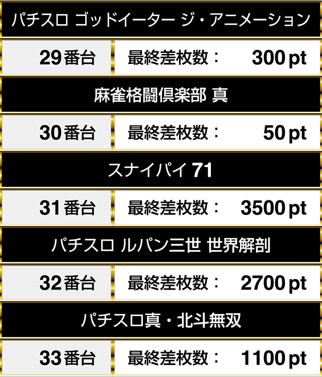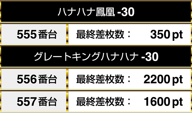 おなじく、沖スロである『ハナハナ鳳凰-30』と『グレートキングハナハナ-30』は2機種を通してプラスptが並んだ。