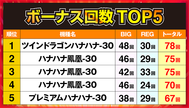 ハイレベルな接戦のなかでトップに立ったのは、78回を記録した「ツインドラゴンハナハナ-30」の1台であった。