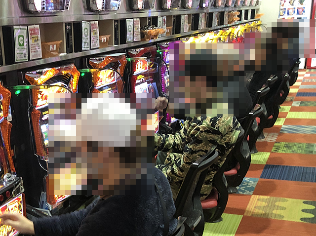 ホールインワンよりも難しいといわれるアルバトロス(アンダー3)クラスのシーンを捉えるべく、パチスロコーナーをまわっていくと、各シマにうれしそうに遊技をおこなっている姿があった。