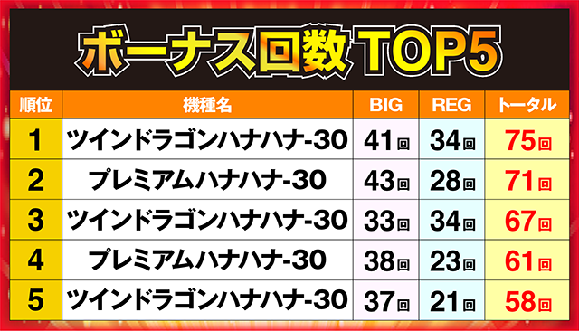 上位4台が60回以上のボーナスに当選しているなかで、75回を記録した「ツインドラゴンハナハナ-30」の1台がNo.1!!