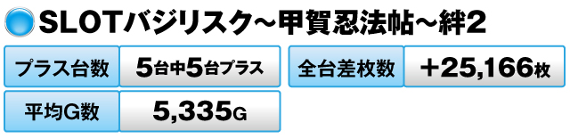 5台すべてがプラスで、全台差枚数は+25,166枚を記録した。