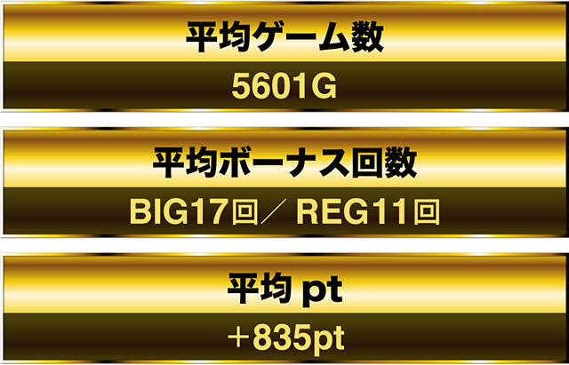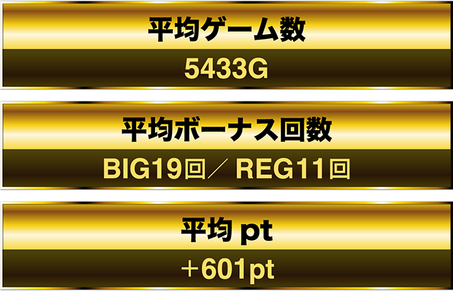 最終的な平均ゲーム数は5433Gで、平均ボーナス回数はBIGとREGをあわせて約30回。平均ptは+600ptを上回った。