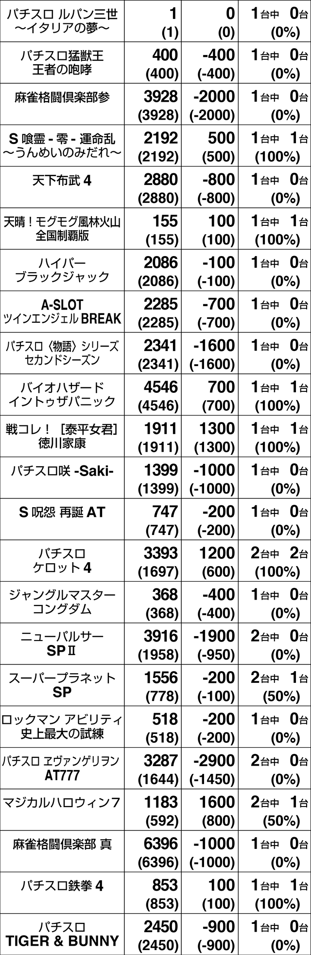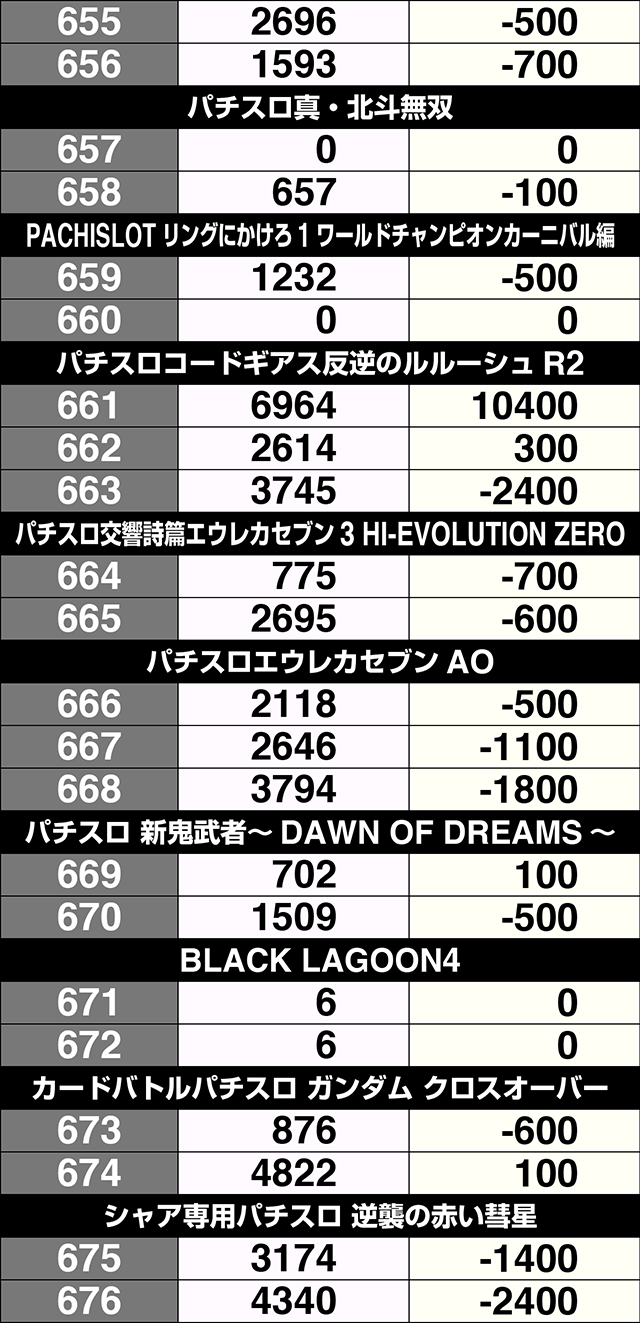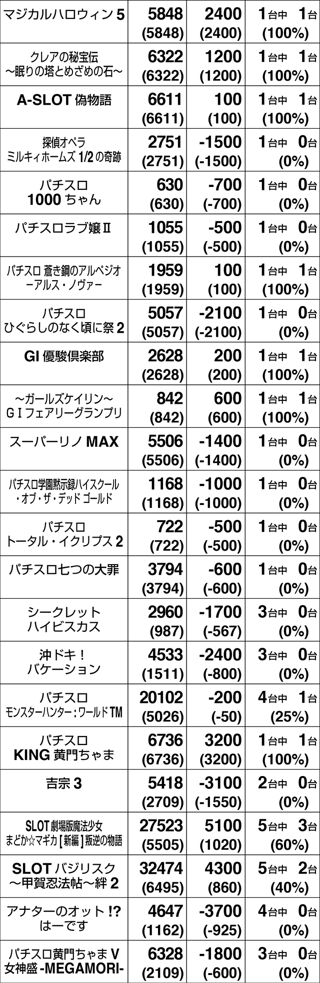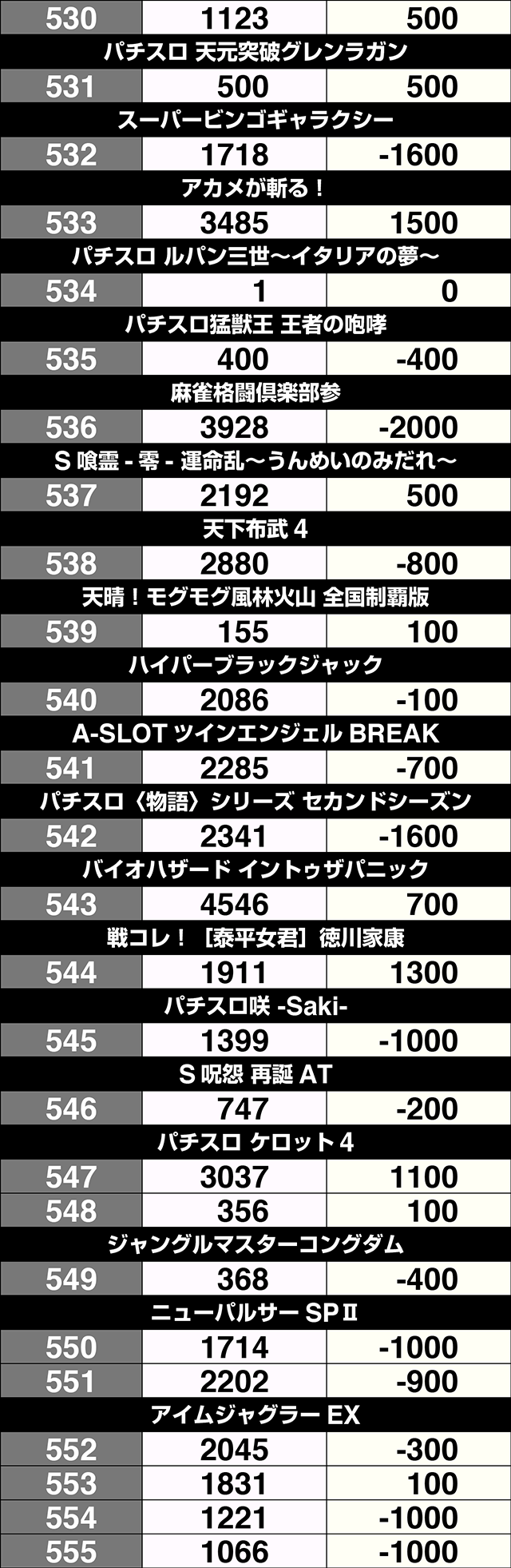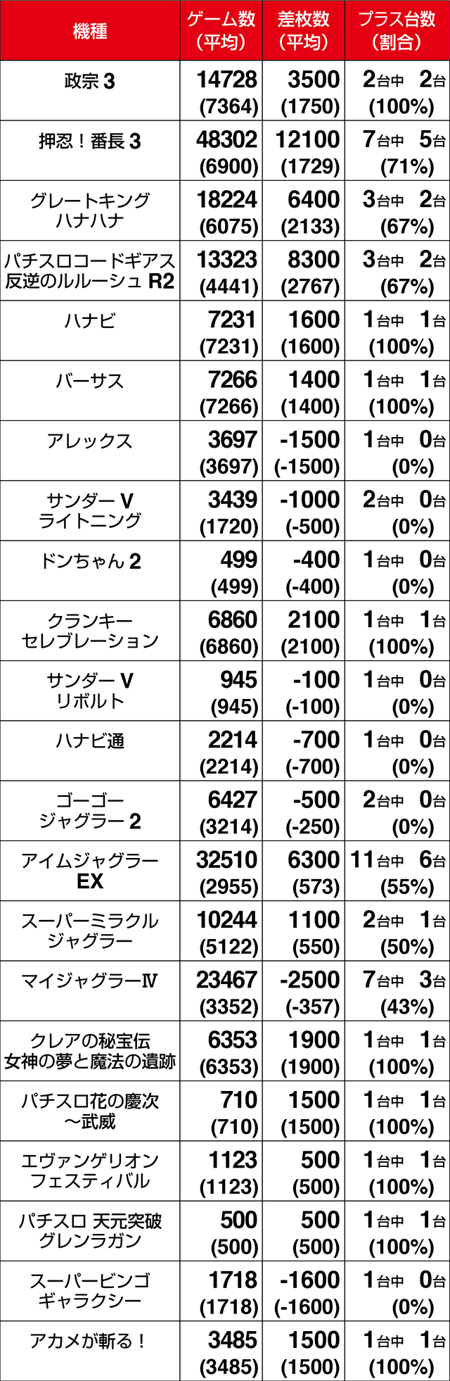 3台中2台がプラスとなった機種も目立っており、『パチスロコードギアス反逆のルルーシュR2』の661番台が+10000ptオーバー、『グレートキングハナハナ』の587番台が+5000ptオーバーを記録した。