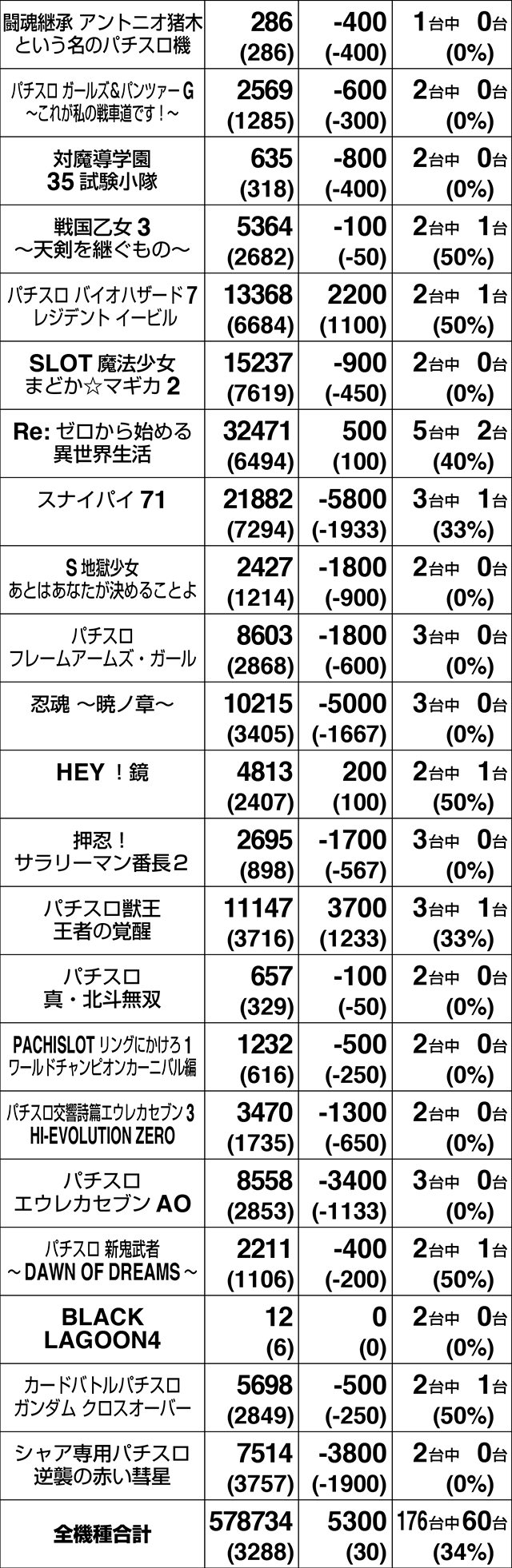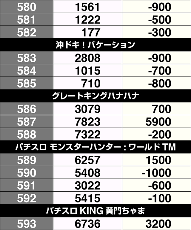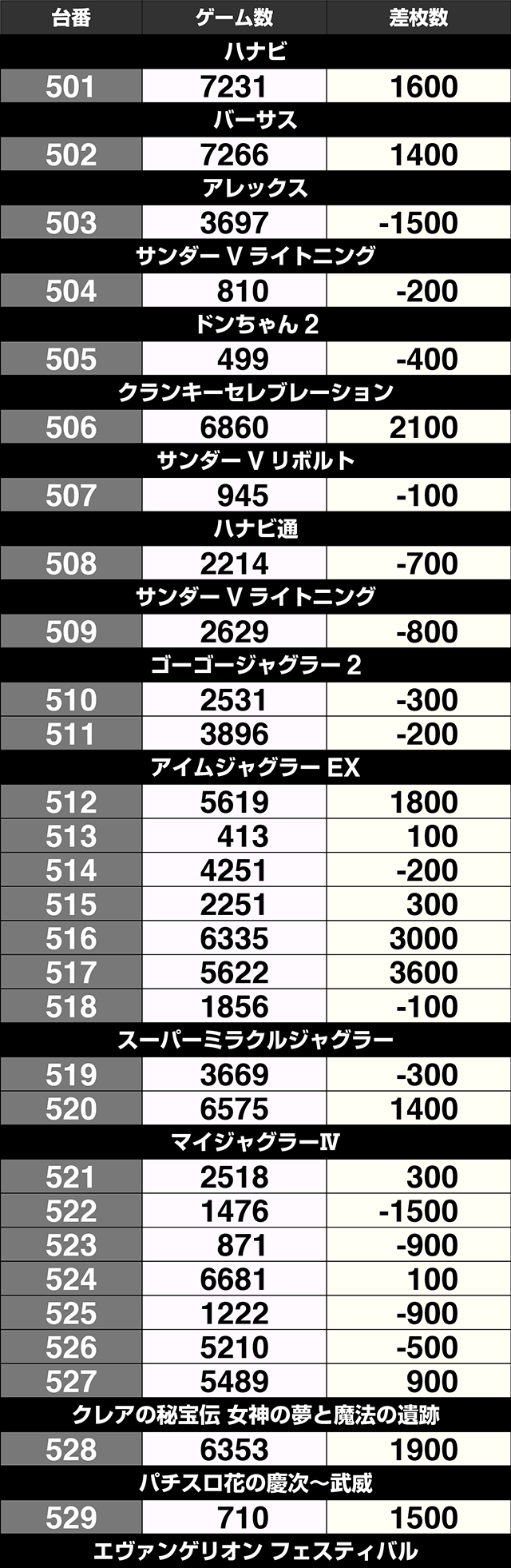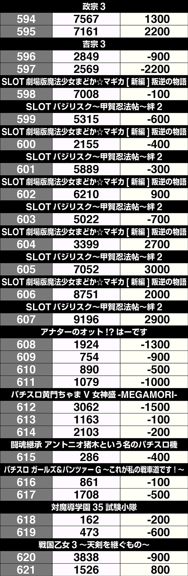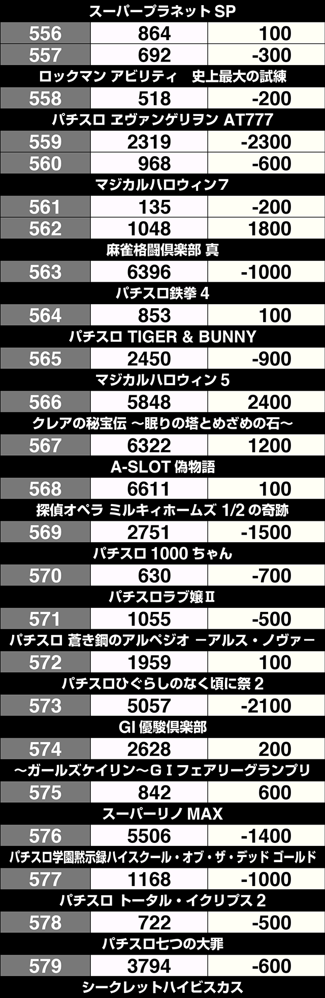 3台中2台がプラスとなった機種も目立っており、『パチスロコードギアス反逆のルルーシュR2』の661番台が+10000ptオーバー、『グレートキングハナハナ』の587番台が+5000ptオーバーを記録した。