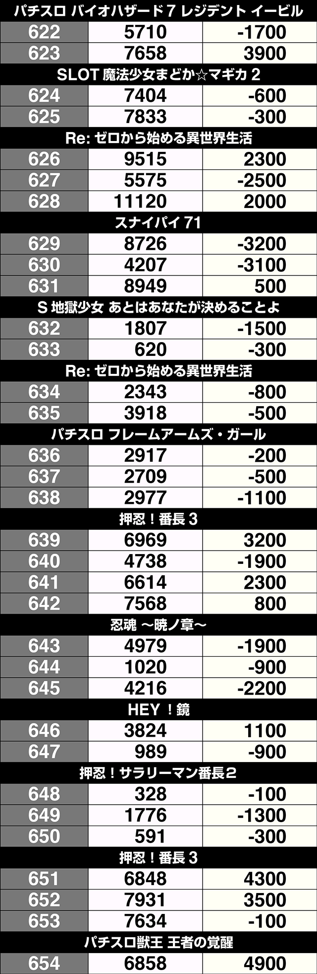 5台設置の機種では、『Re:ゼロから始める異世界生活』が626番台と628番台が+2000ptを上回り、『SLOT劇場版魔法少女まどか☆マギカ[新編]叛逆の物語』は半数以上の台がプラスであった。
