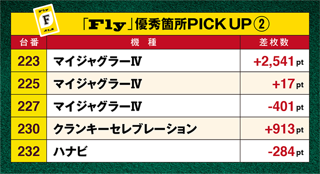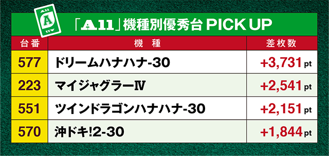 7台が設置されている「マイジャグラーⅣ」に+2541pt、「沖ドキ!2-30」には+1844ptのデータが残った。