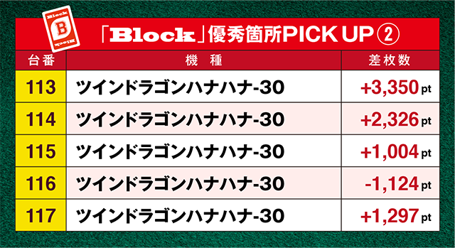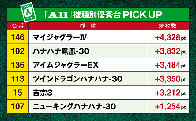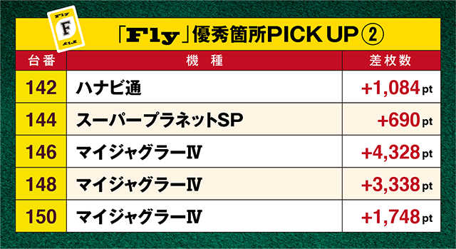 「ハナハナ鳳凰-30」の102番台は+3832pt、「押忍!番長3」の130番台は+3454ptと、多彩なスペックの機種が好成績を残した。