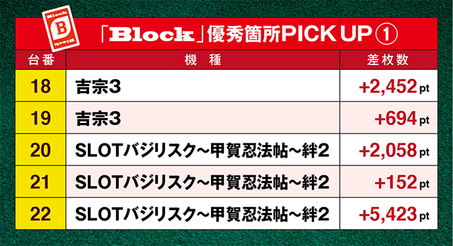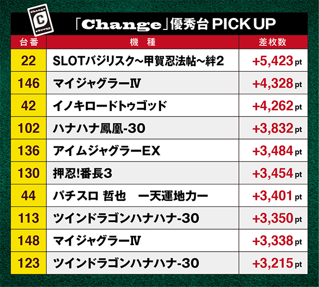 前日の成績から華麗なる“Change”を遂げた「SLOTバジリスク~甲賀忍法帖~絆2」の22番台と「マイジャグラーⅣ」の146番台が+4000pt超!