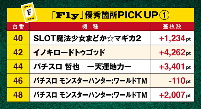 「SLOT魔法少女まどか☆マギカ2」の40番台と「イノキロードトゥゴッド」の42番台、「パチスロ 哲也 ー天運地力ー」の44番台の3台が、飛び飛びで+1000ptオーバーを記録!