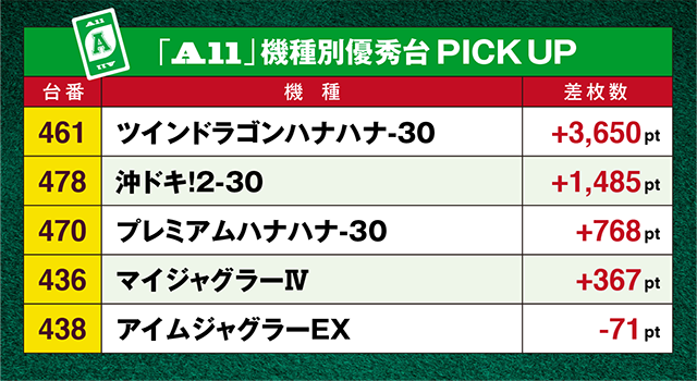 16台設置されている「ツインドラゴンハナハナ-30」の461番台が3000pt超!