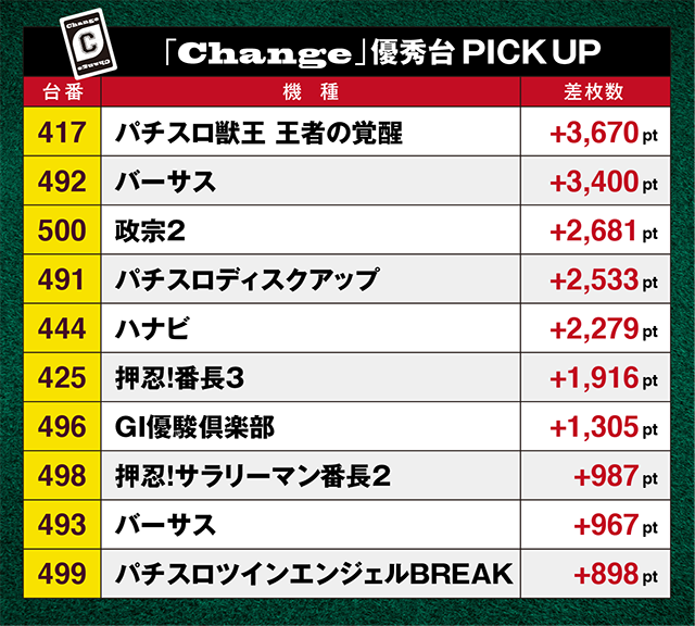 500番台の「政宗2」や「パチスロディスクアップ」の491番台なども+2000ptを上回る好成績。