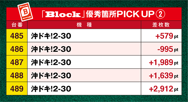 485番台から489番台までの「沖ドキ!2-30」は、5台中4台に固まってプラスが並んだ。