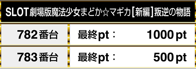 『SLOT劇場版魔法少女まどか☆マギカ[新編]叛逆の物語』にもプラスptが並ぶ場所があり、1台は1000ptを記録した。