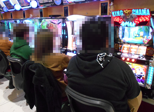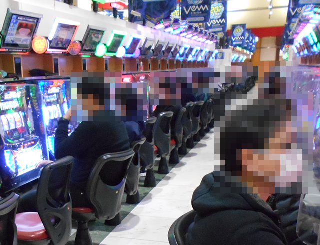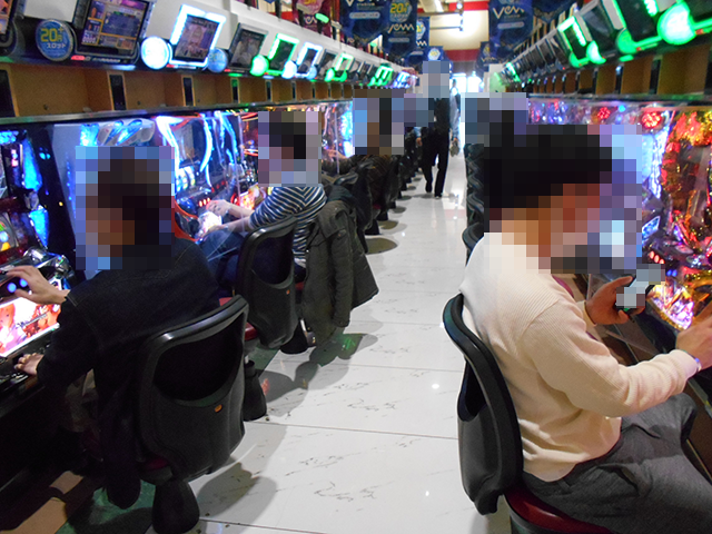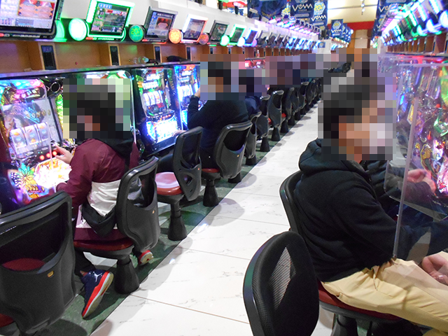 午後のホール内にはたくさんのプレイヤーが集まっており、パチンコとパチスロの両方がにぎやかな状況となっていた。