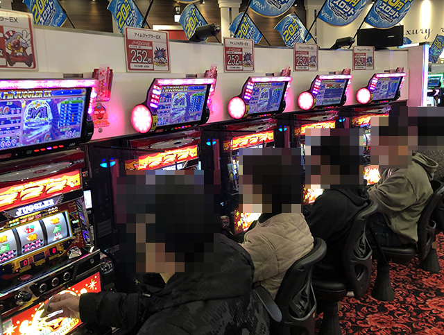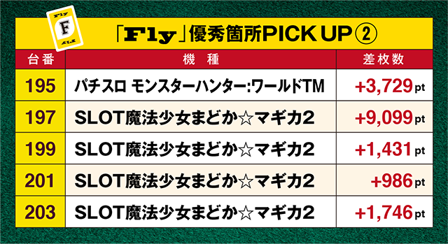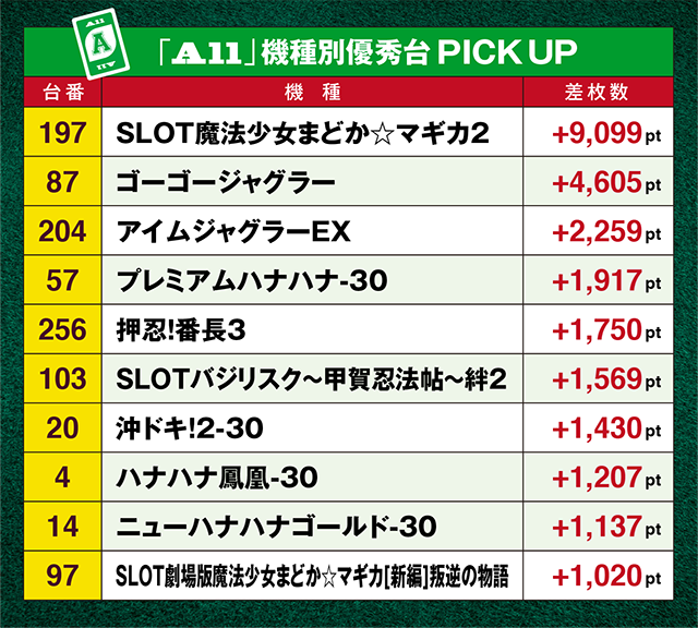 「SLOT魔法少女まどか☆マギカ2」などが並ぶシマにも飛び飛びでプラスptとなる場所があり、197番台は+9000ptを上回った。