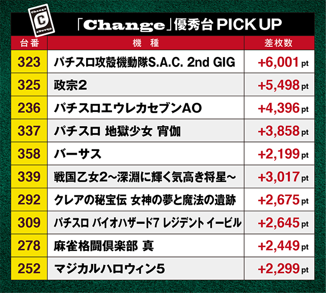 「パチスロエウレカセブンAO」の236番台と「パチスロ 地獄少女 宵伽」の337番台も+3000pt以上を記録するなど、設置台数の少ない機種にみどころが多かった。