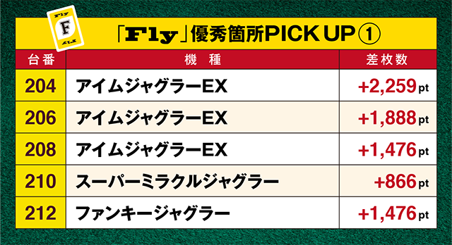 「アイムジャグラーEX」の204番台から「ファンキージャグラー」の212番台までの9台が1台飛ばしてプラスpt!