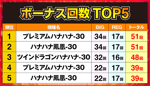 「プレミアムハナハナ-30」と「ハナハナ鳳凰-30」のそれぞれ1台が、この日のトップとなる51回を記録した。