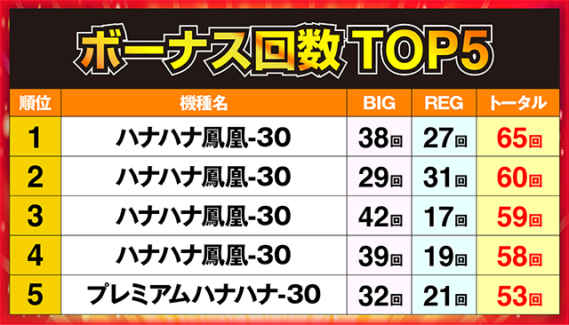 首位を獲得したのは、ボーナス回数65回を記録した1台だ。
