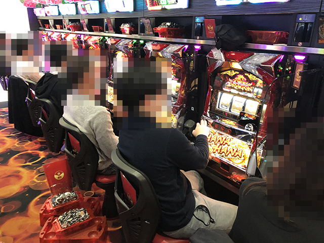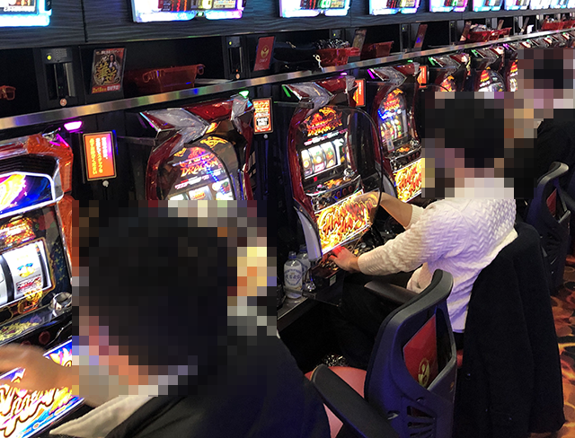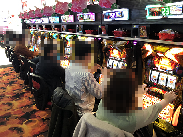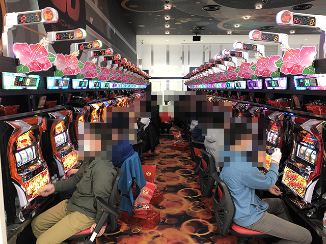 16台中11台が埋まっていた「プレミアムハナハナ-30」にて、プレイヤーたちが華麗なパフォーマンスを披露。機種が持つ魅力を堪能しているためか、満面の笑みを浮かべてストップボタンを押していたことを覚えている。