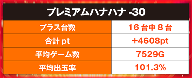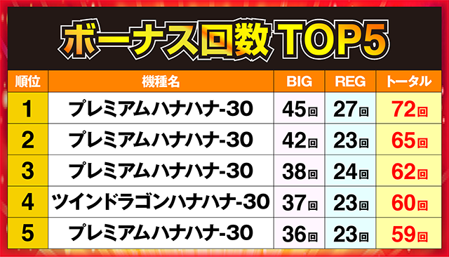4台の「プレミアムハナハナ-30」がランクインし、ボーナス回数72回を記録した1台がトップを独走!