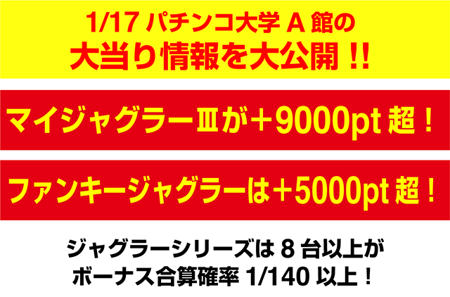 1月17日、ジャグラーシリーズを中心に「パチンコ大学A館」のパチスロコーナーを分析。