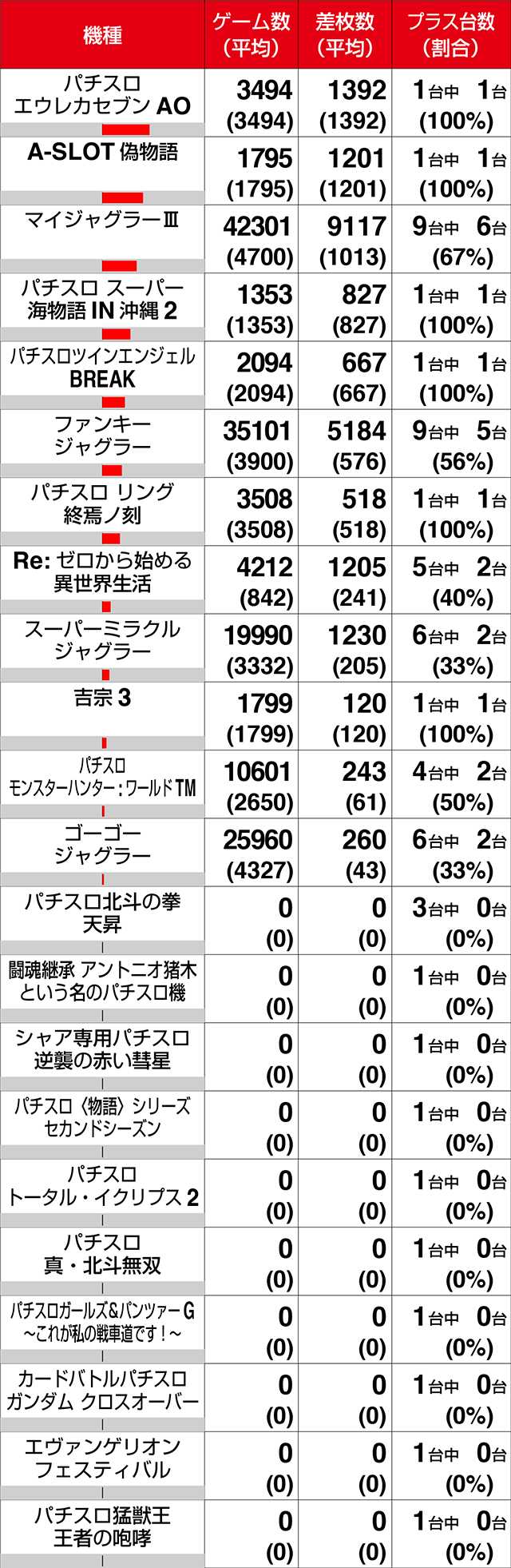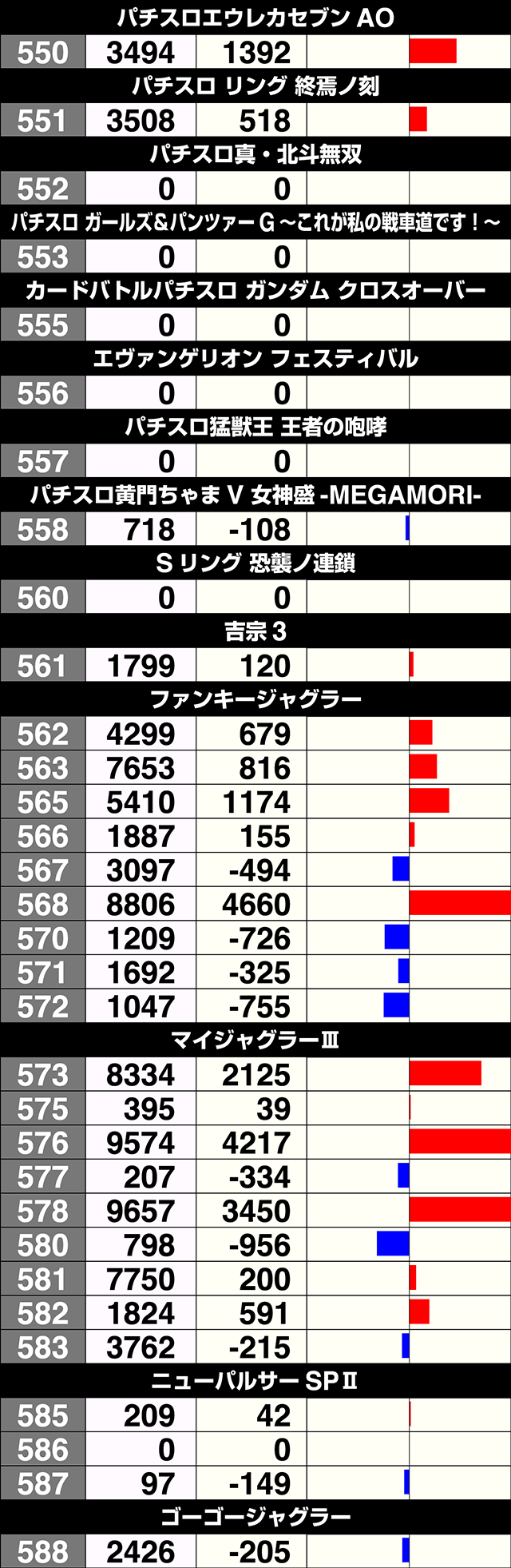 設置台数が1台の機種では、『パチスロエウレカセブンAO』の550番台と『A-SLOT偽物語』の633番台が+1000ptを超えた。