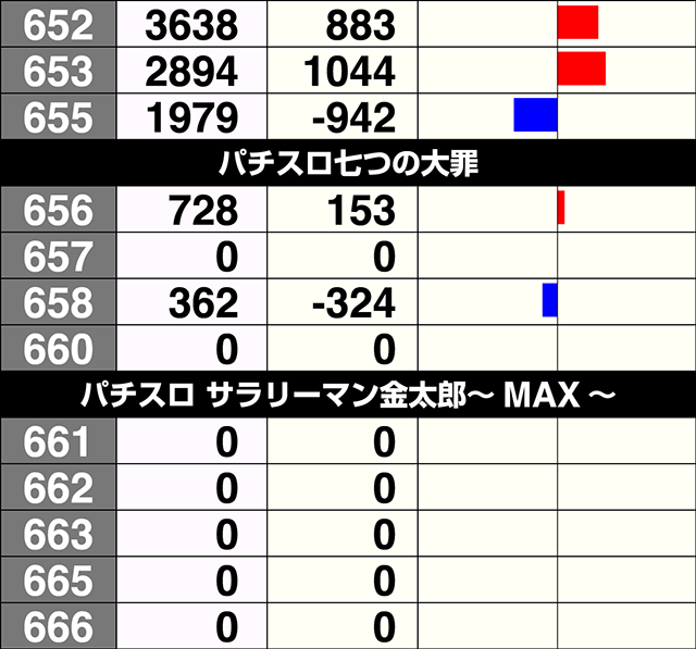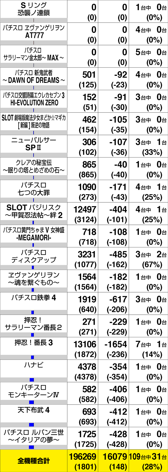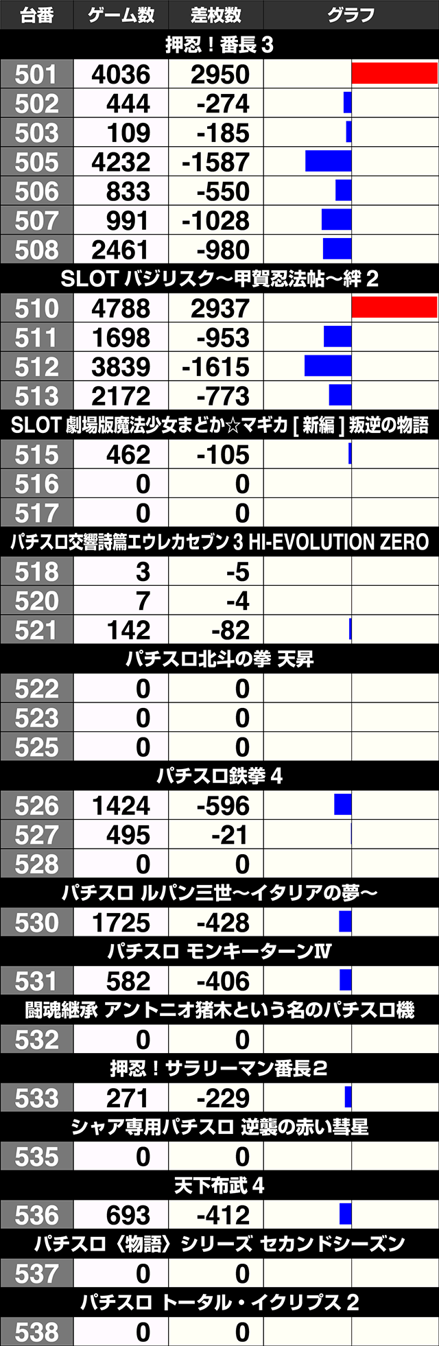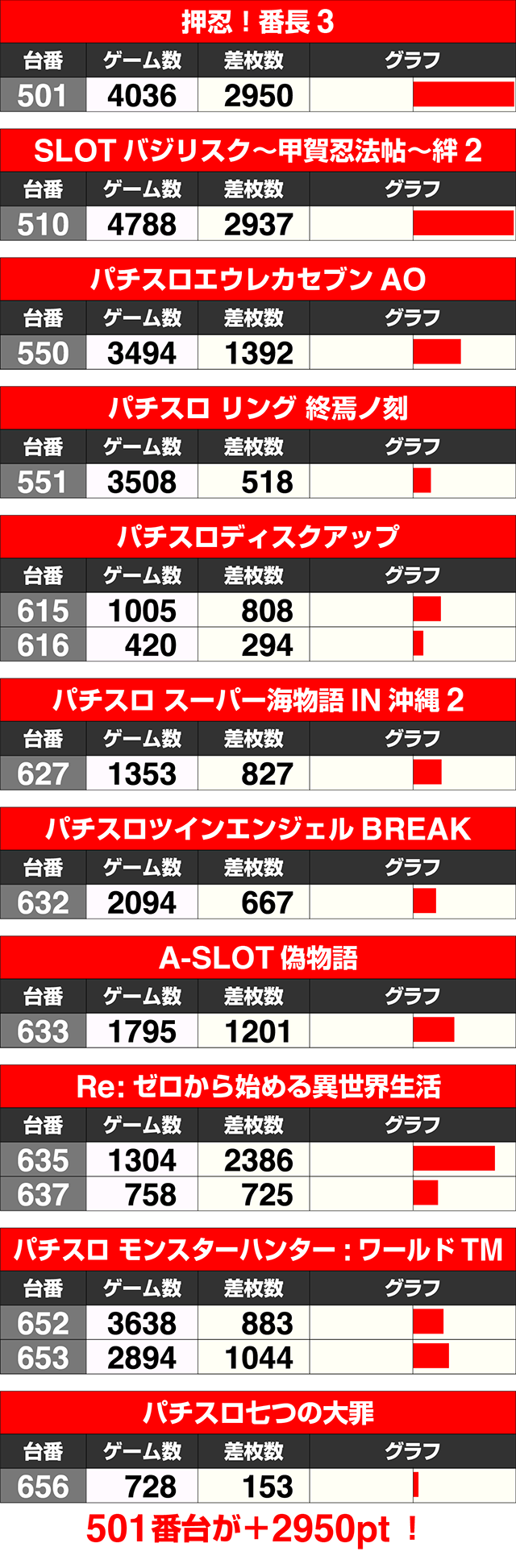 501番台の『押忍!番長3』と510番台の『SLOTバジリスク~甲賀忍法帖~絆2』は差枚数+2000ptオーバー。