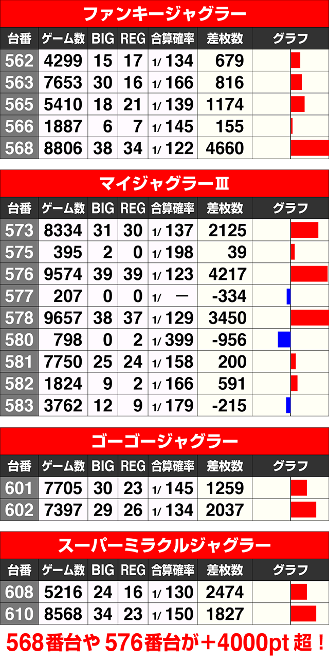 この日のトップは、+4660ptを記録した『ファンキージャグラー』の578番台。シリーズ全体でみると、6台が2000ptを超え、そのうち2台は4000ptを上回った。