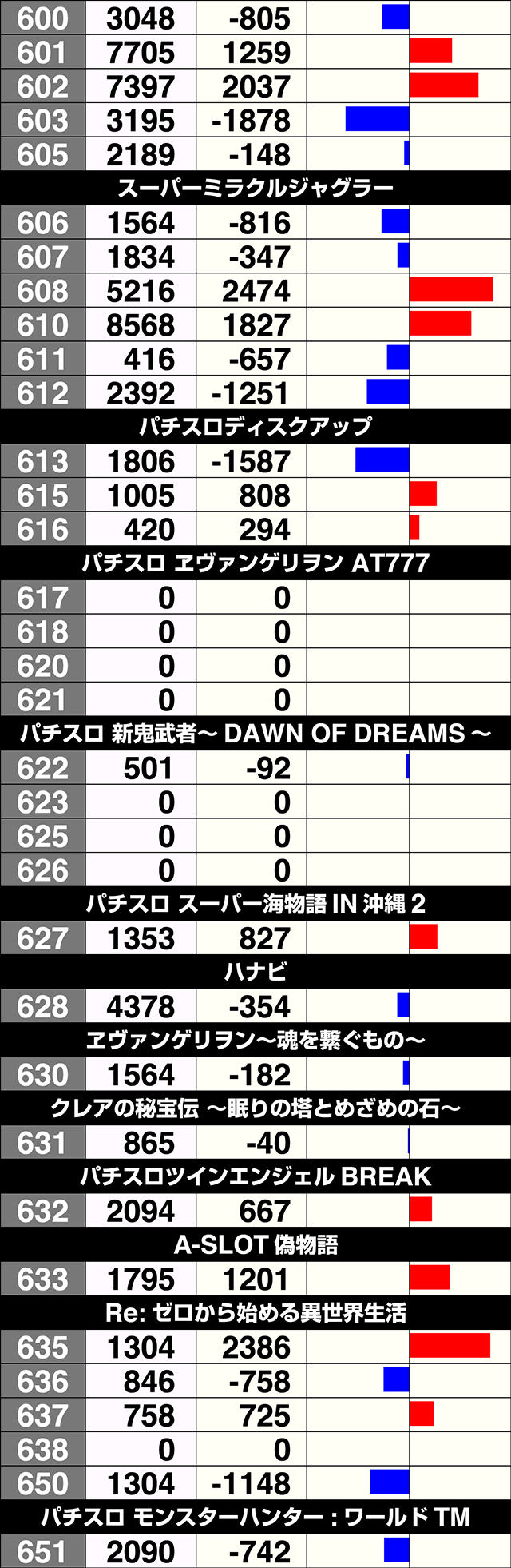 『Re:ゼロから始める異世界生活』は635番台が+2000ptを超え、機種全体の平均差枚数は1000ptオーバー。