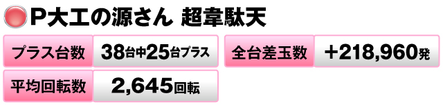38台中25台がプラスで全台差玉数は+218,960発を記録した。