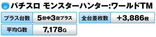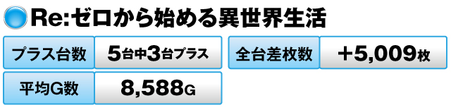 5台中3台がプラスで全台差枚数は+9,955枚、平均G数は9,210Gをマークした。