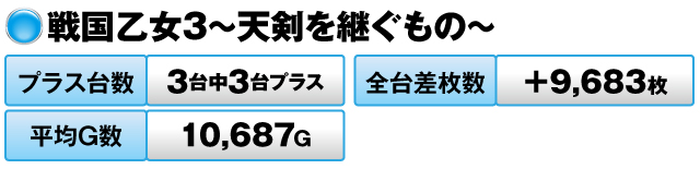 3台すべてがプラスで全台差枚数は+9,683枚、平均G数に至っては実に10,687Gにも達している。