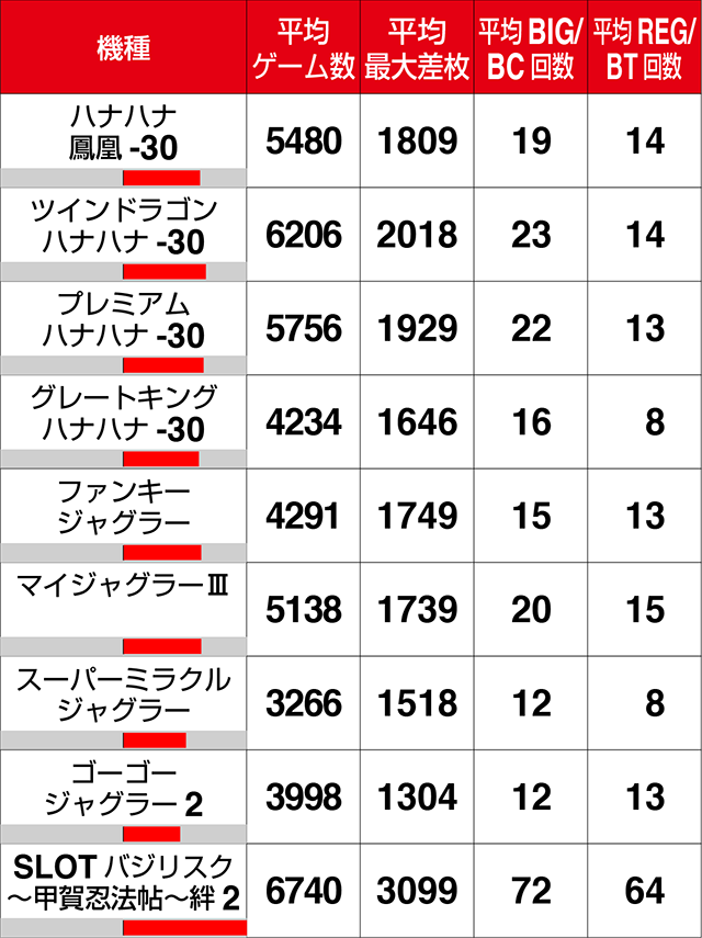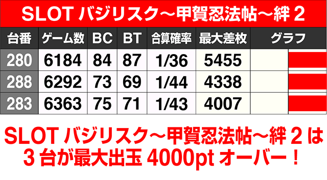 『SLOTバジリスク~甲賀忍法帖~絆2』も目立っており、3台の最大差枚数が+4000ptオーバー。設置されている9台の平均最大差枚数は+3000ptを超えた。