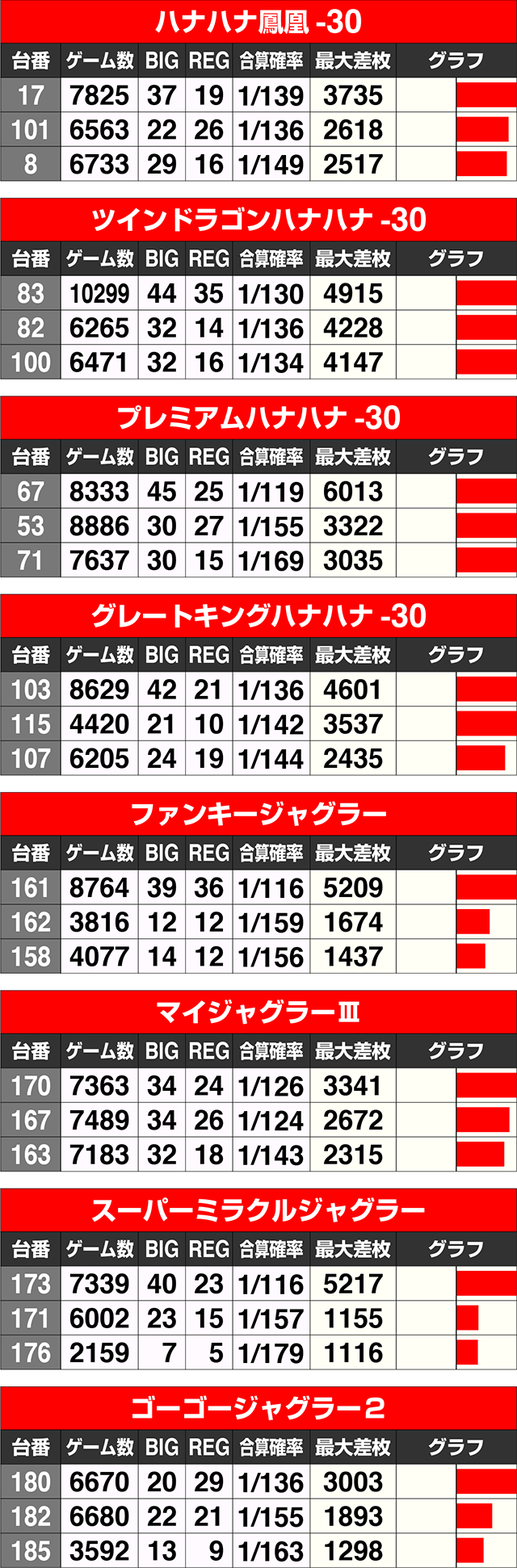 『ファンキージャグラー』の161番台と『スーパーミラクルジャグラー』の173番台は最大差枚数が+5000ptを上回った。