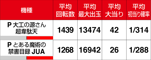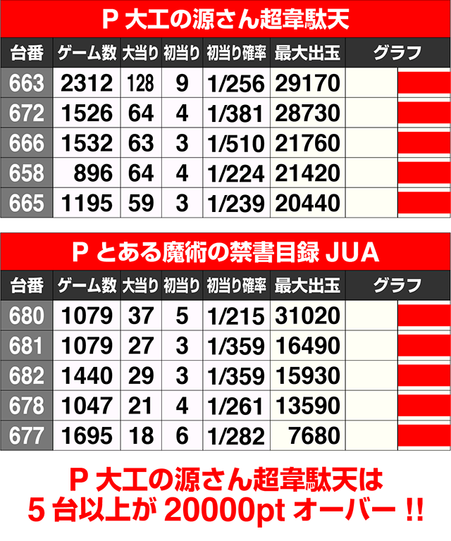 『P大工の源さん 超韋駄天』は5台の最大出玉が20000ptを超え、663番台と672番台が最大出玉+25000ptを超えた。