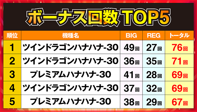 1位と2位には、ボーナス回数が70回を超えた「ツインドラゴンハナハナ-30」がランクイン!!