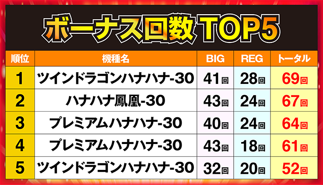 2位には67回の「ハナハナ鳳凰-30」、3位には64回の「プレミアムハナハナ-30」がランクインするなど、ハイレベルなTOP5であった。