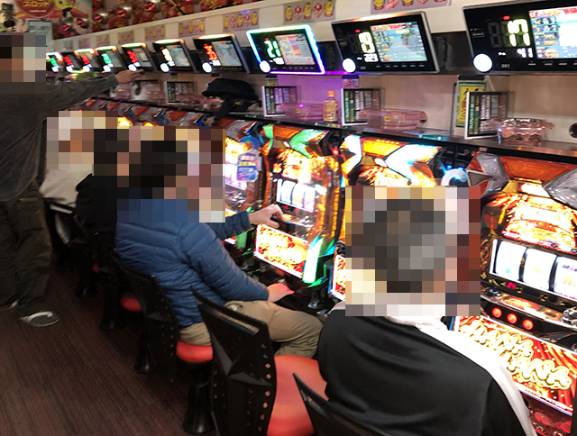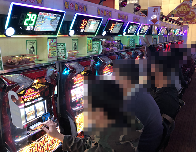10台設置されている「プレミアムハナハナ-30」では、7名が楽しそうに遊技をおこなっていた。