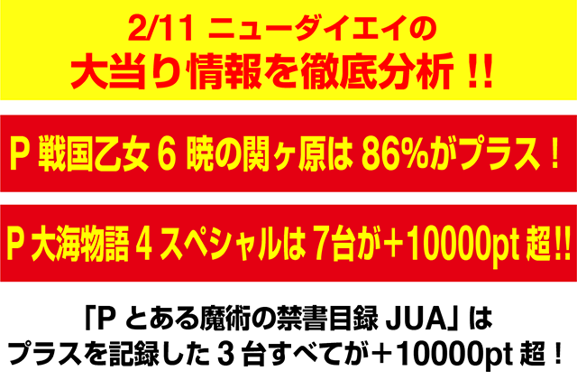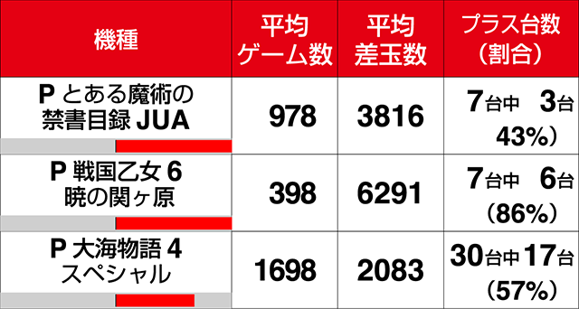 『P戦国乙女6 暁の関ヶ原』は7台中6台がプラスで、平均差玉は+6000ptを上回った。