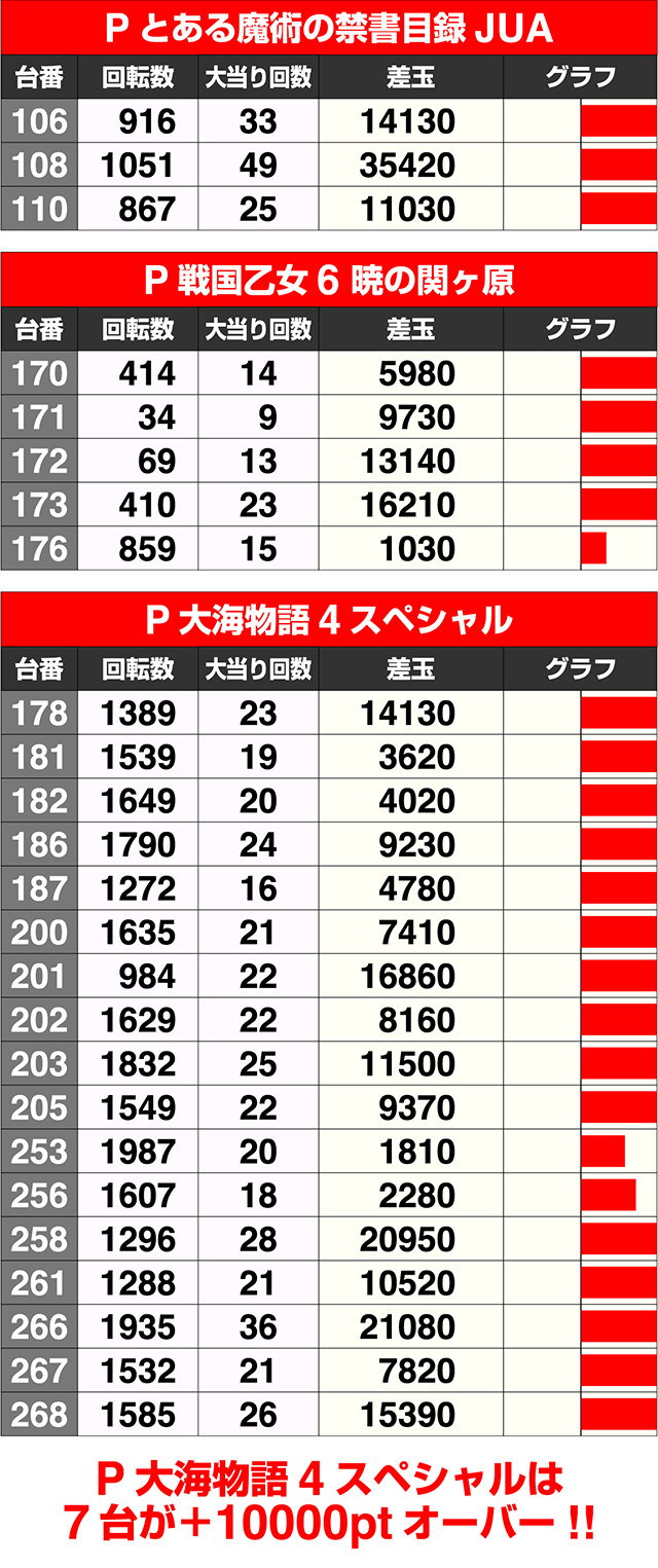 『P大海物語4スペシャル』は30台中17台がプラスで、7台が+10000ptを超えた。