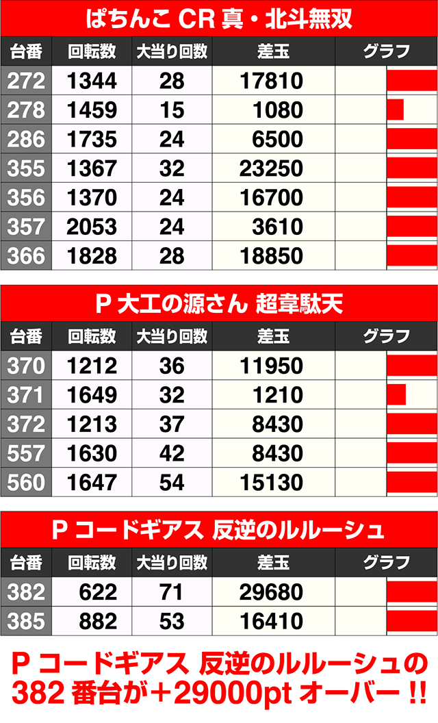 3台設置の『Pコードギアス 反逆のルルーシュ』は2台が+15000ptを上回り、382番台は30000ptに迫る記録を残した。