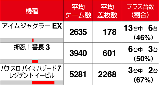 13台設置の『アイムジャグラーEX』は、平均ゲーム数が3000G未満と控えめだったものの、半数近い6台がプラスであった。