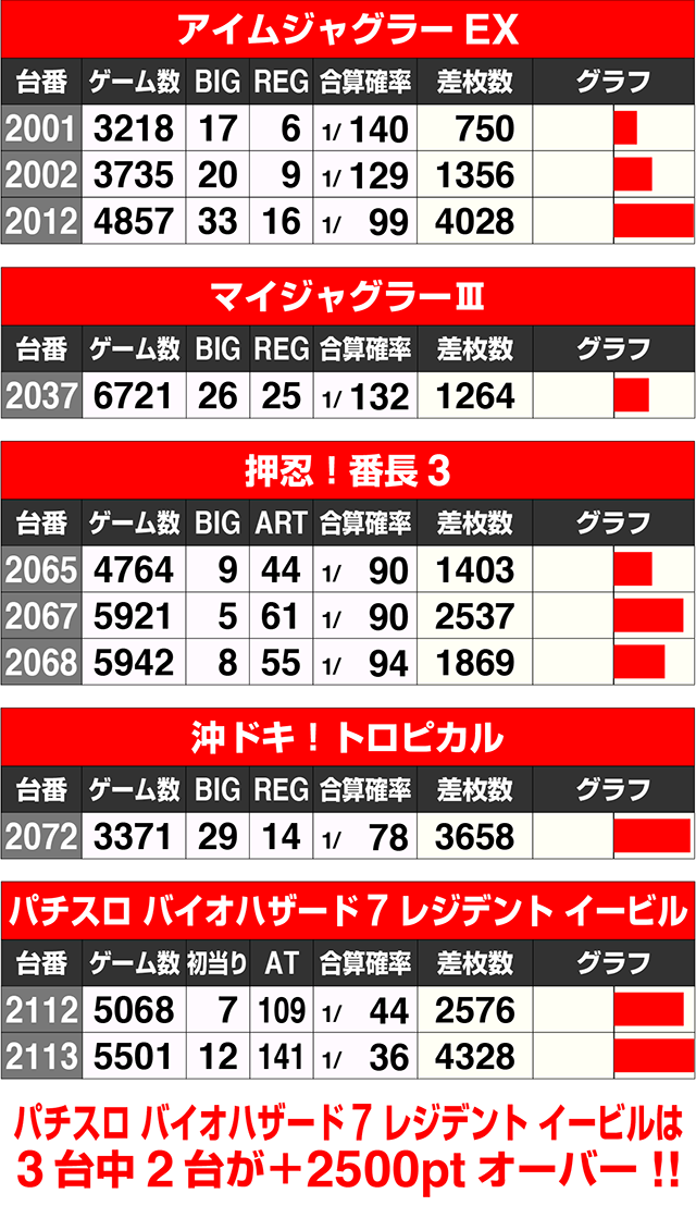 『パチスロ バイオハザード7 レジデント イービル』は3台中2台がプラスで、平均差枚数は+2000ptを超えた。
