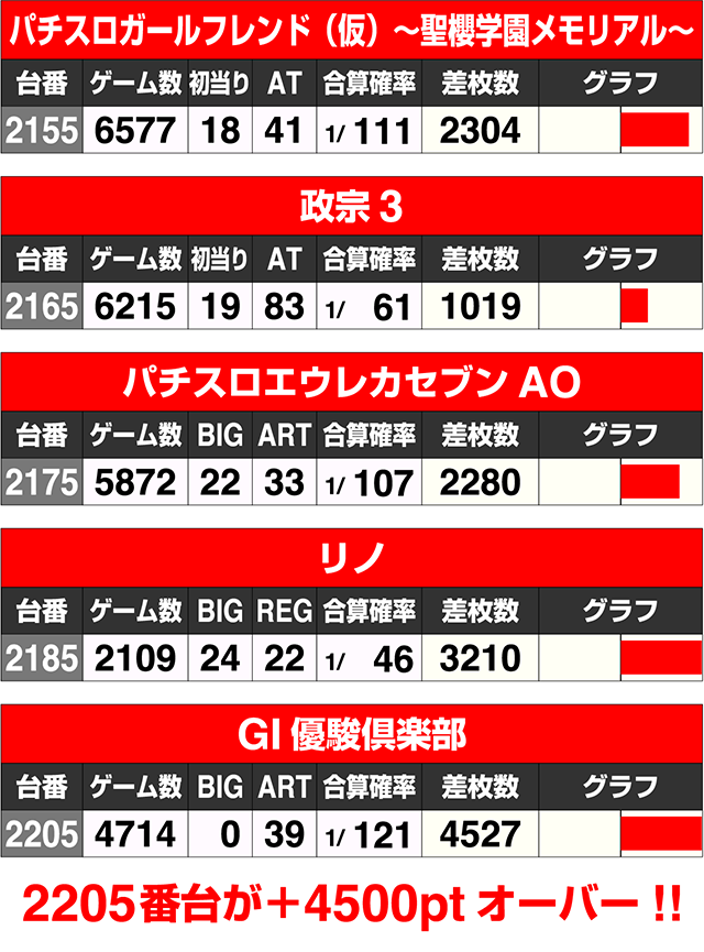 『パチスロエウレカセブンAO』2175番台や『パチスロガールフレンド(仮)~聖櫻学園メモリアル~』2155番台などが+2000ptを上回った。
