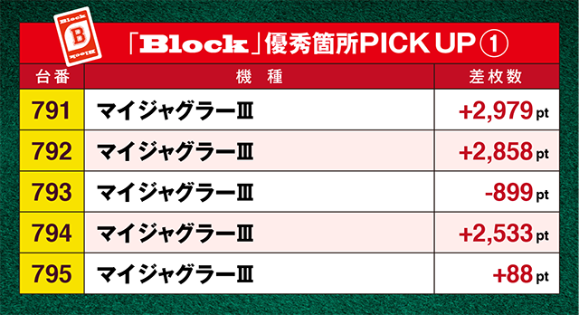 791番台と792番台、794番台と795番台にプラスptが固まり、どちらにも+2000ptを上回る台があった。