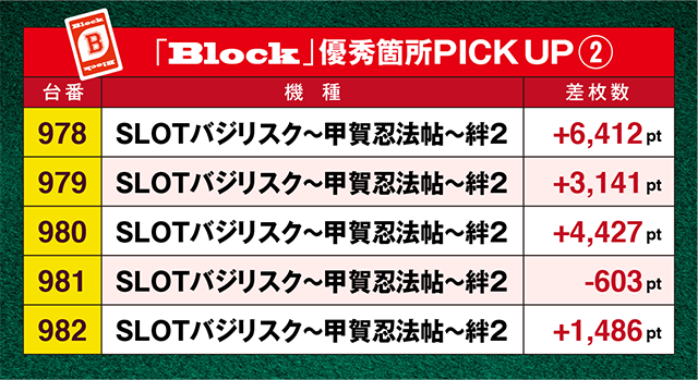 「SLOTバジリスク~甲賀忍法帖~絆2」は978番台と979番台、そして980番台が固まってプラスpt!