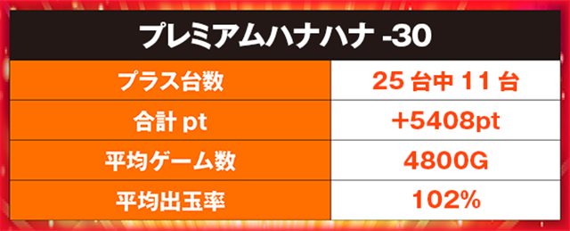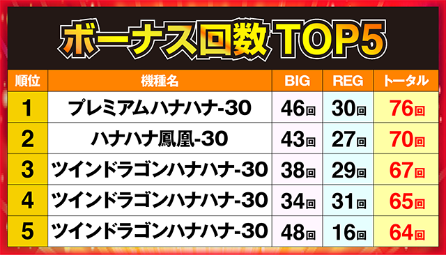 ハイレベルなランキングの頂点に立ったのは、76回を記録した「プレミアムハナハナ-30」の1台であった。