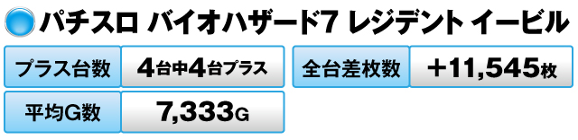 4台すべてがプラスで全台差枚数が+11,545枚、平均G数も7,333Gを記録した。